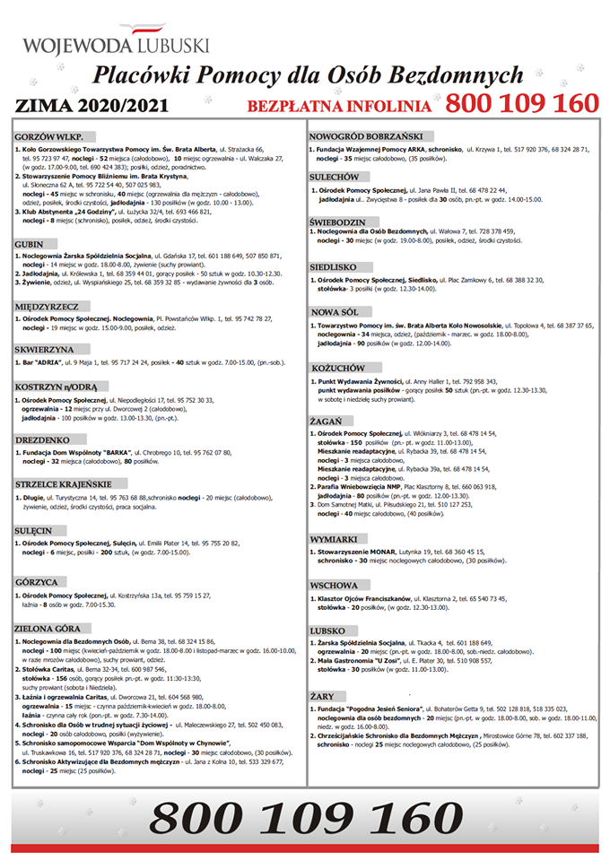 Bezpłatna infolinia 800 109 160 – pod tym numerem można uzyskać informacje o placówkach dla osób bezdomnych, które oferują miejsca noclegowe i ciepłe posiłki.