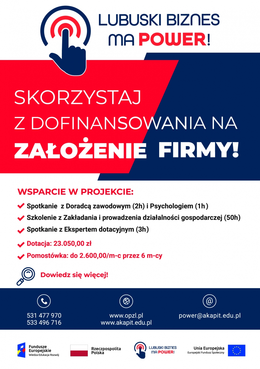 Organizacja Pracodawców Ziemi Lubuskiej wspólnie z Partnerem –firmą Akapit z Żar, realizuje projekt: Lubuski Biznes ma POWER! w ramach którego wesprze 150 os. z woj. lubuskiego w otwarciu własnej działalności gospodarczej. Wsparcie jest skierowane do osób z woj. lubuskiego, pozostających bez pracy, bezrobotnych i biernych zawodowo niezarejestrowanych w PUP, w wieku 18-29 lat, którzy utracili zatrudnienie z powodu pandemii COVID-19  po 1.03.2020 r.