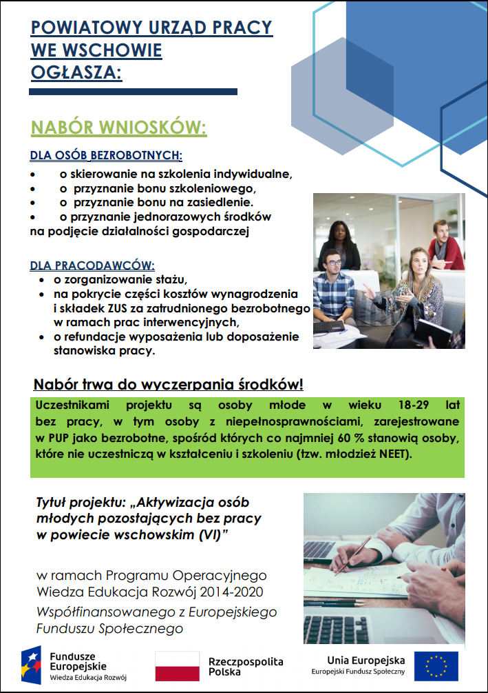 Powiatowy Urząd Pracy informuje, iż od dnia 01.01.2021 do 31.12.2022 realizuje projekt pt. : „Aktywizacja osób młodych pozostających bez pracy w powiecie wschowskim (VI)”, współfinansowany ze środków Unii Europejskiej.
