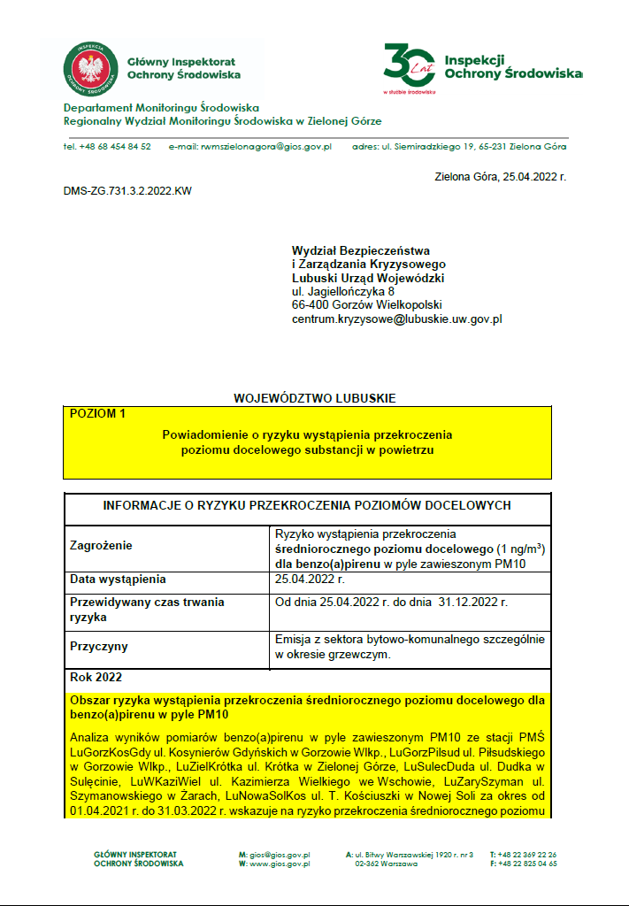 Powiadomienie o ryzyku wystąpienia przekroczenia poziomu docelowego substancji w powietrzu 2022-04-25-Ryzyko_BaP