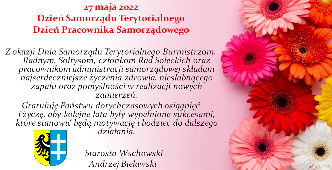Z okazji Dnia Samorządu Terytorialnego Burmistrzom, Radnym, Sołtysom, członkom Rad Sołeckich oraz pracownikom administracji samorządowej składam najserdeczniejsze życzenia zdrowia, niesłabnącego zapału oraz pomyślności w realizacji nowych zamierzeń.