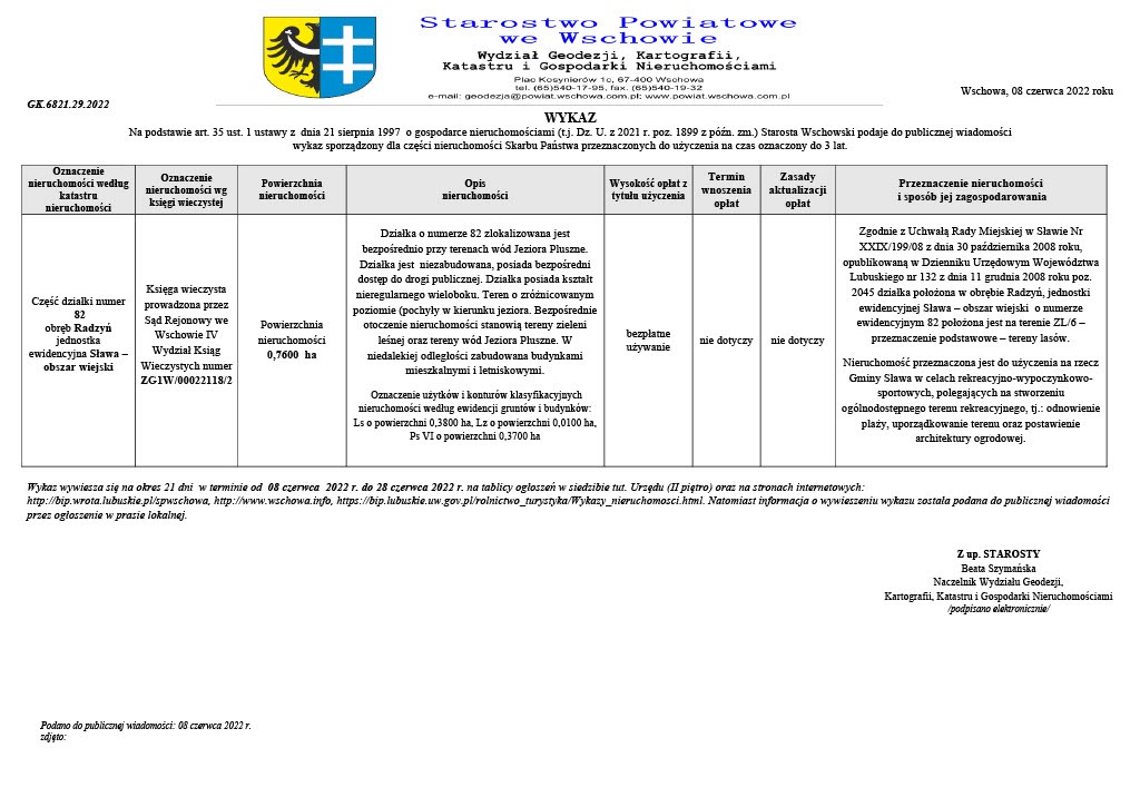 Starosta Wschowski podaje do publicznej wiadomości wykaz sporządzony dla części nieruchomości Skarbu Państwa przeznaczonych do użyczenia na czas oznaczony do 3 lat. wykaz – użyczenie