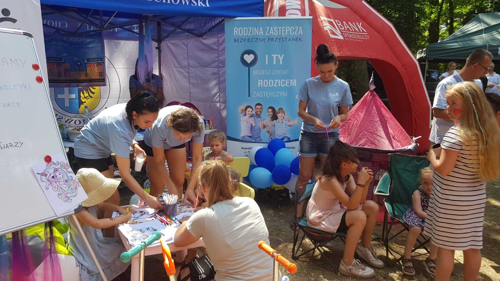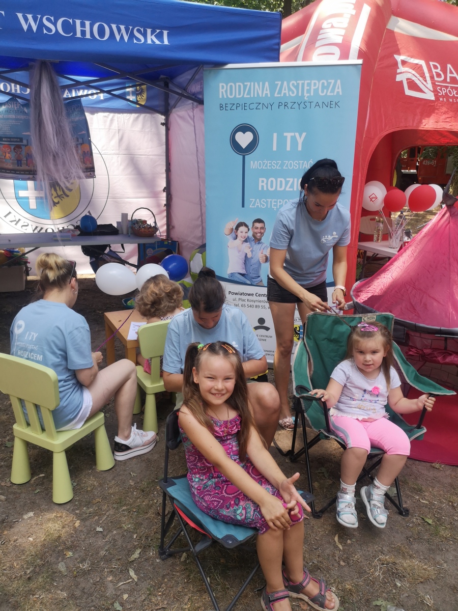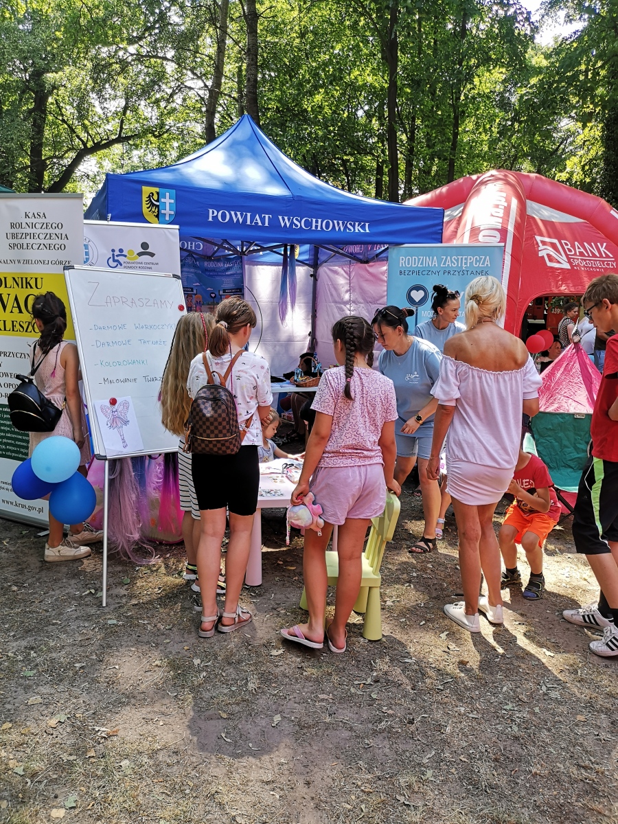 z produktem polskim w Szlichtyngowej. Podczas pikniku pracownicy PCPR promowali ideę rodzicielstwa zastępczego poprzez rozpowszechnienie ulotek informacyjnych, dodatkowo rozdawane były gadżety promocyjne m.in. długopisy, notesy, torby zakupowe. Dużym zainteresowaniem cieszyły się atrakcje dla dzieci przygotowane przez pracowników PCPR tj. malowanie twarzy, zaplatanie kolorowych warkoczyków, kolorowe tatuaże oraz stoisko z kolorowankami. Osoby dorosłe odwiedzające stoisko Powiatu Wschowskiego/Powiatowego Centrum Pomocy Rodzinie we Wschowie mogły uzyskać informację nt. rodzicielstwa zastępczego, natomiast ich pociechy w tym czasie miały możliwość kreatywnej zabawy i skorzystania z bezpłatnych atrakcji.