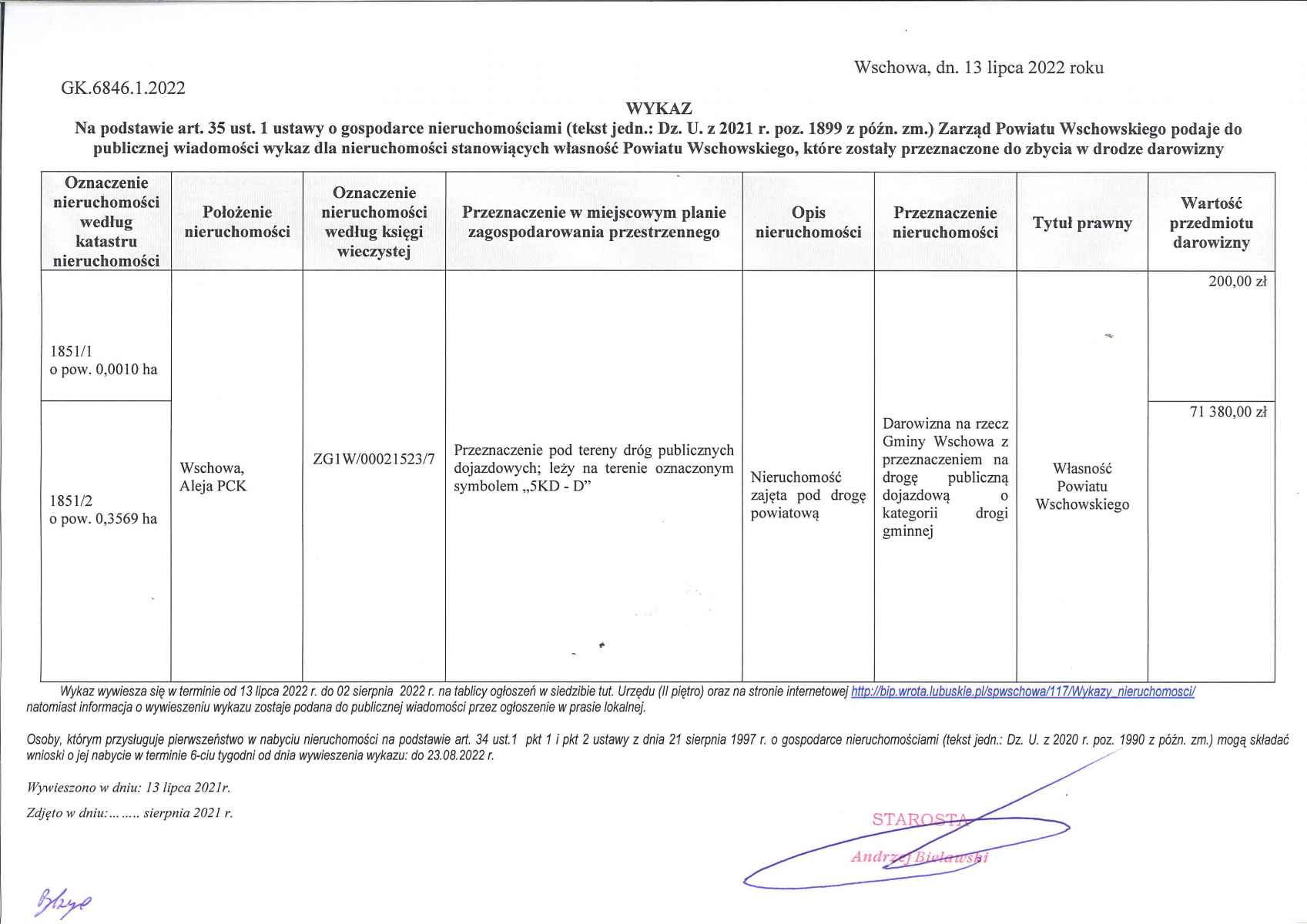 Wykaz dla nieruchomości stanowiących własność Powiatu Wschowskiego, które zostały przeznaczone do zbycia w drodze darowizny