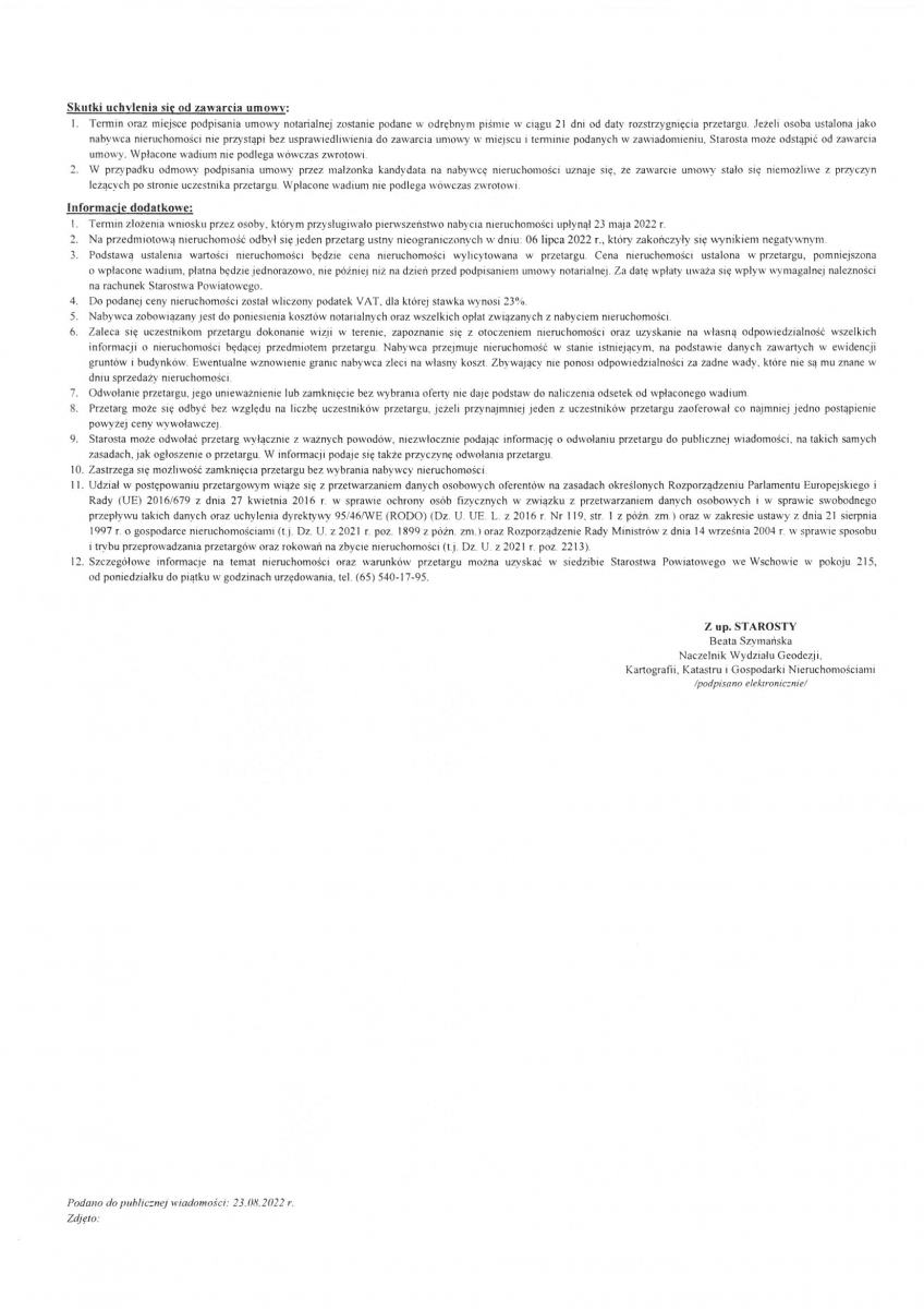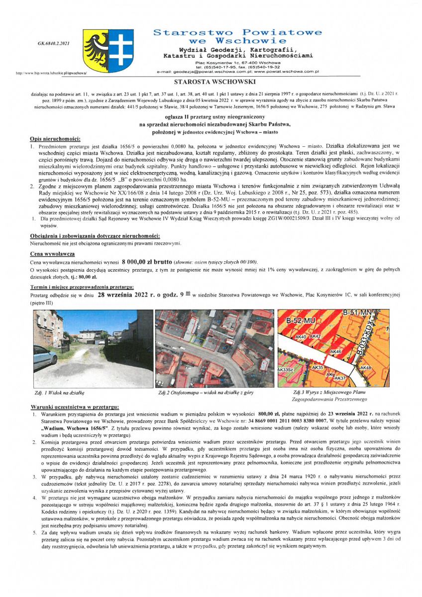 II przetarg ustny nieograniczony na sprzedaż nieruchomości niezabudowanej Skarbu Państwa, położonej w jednostce ewidencyjnej Wschowa – miasto
