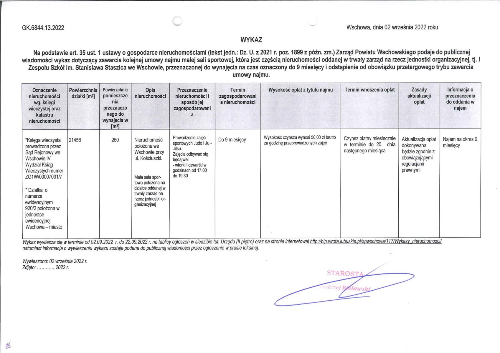 Wykaz dotyczący zawarcia kolejnej umowy najmu małej sali sportowej, która jest częścią nieruchomości oddanej w trwały zarząd na rzecz jednostki organizacyjnej, tj. I Zespołu Szkół im. Stanisława Staszica we Wschowie, przeznaczonej do wynajęcia na czas oznaczony do 9 miesięcy i odstąpienie od obowiązku przetargowego trybu zawarcia umowy najmu.