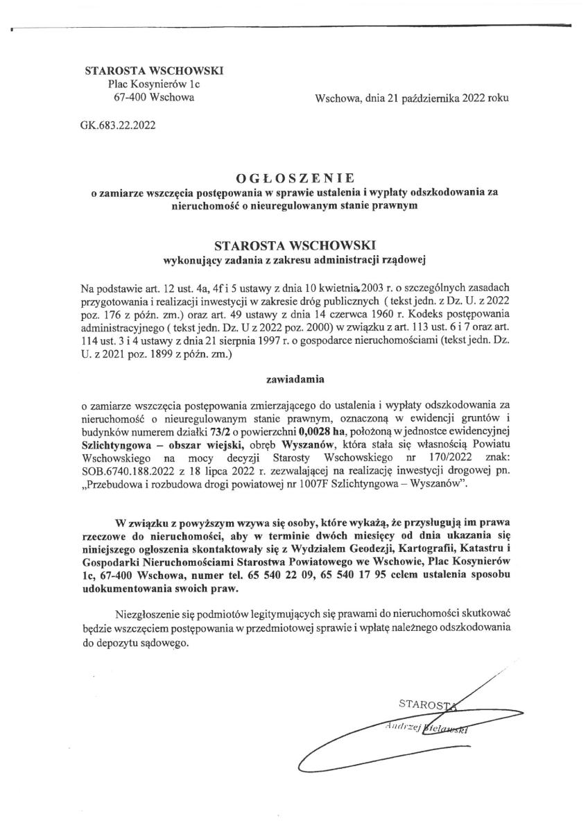 Ogłoszenie Starosty Wschowskiego o zamiarze wszczęcia postępowania w sprawie ustalenia i wypłaty odszkodowania za nieruchomość o nieuregulowanym stanie prawnym Ogłoszenie o zamiarze wszczęcia text