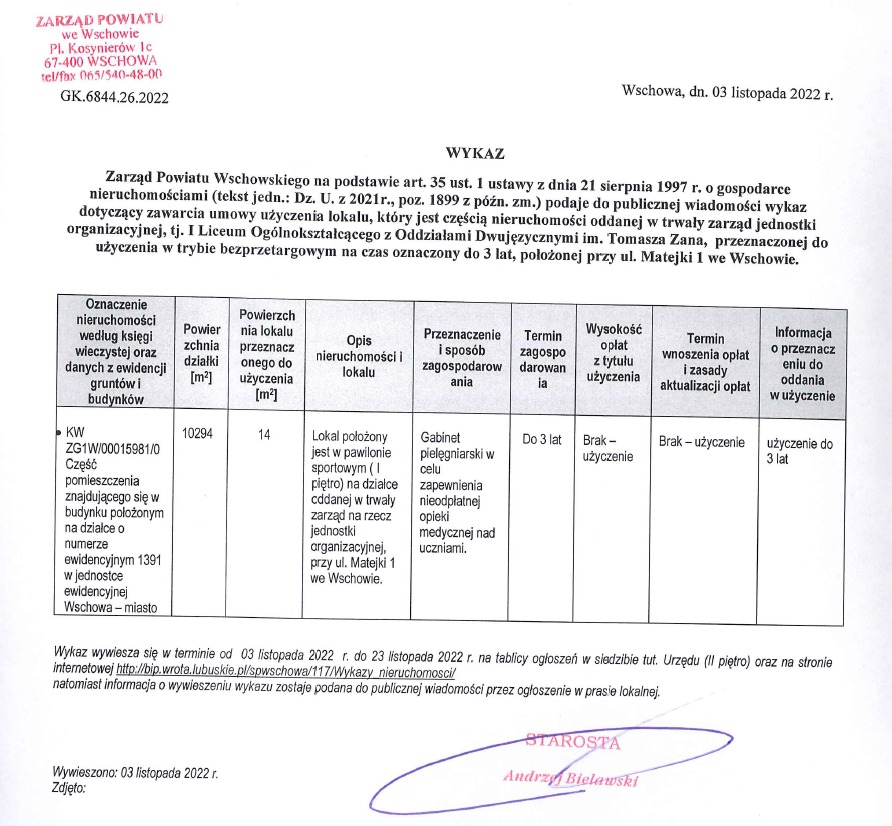 Wykaz dotyczący zawarcia umowy użyczenia lokalu, który jest częścią nieruchomości oddanej w trwały zarząd jednostki organizacyjnej, tj. I Liceum Ogólnokształcącego z Oddziałami Dwujęzycznymi im. Tomasza Zana, przeznaczonej do użyczenia w trybie bezprzetargowym na czas oznaczony do 3 lat, położonej przy ul. Matejki 1 we Wschowie