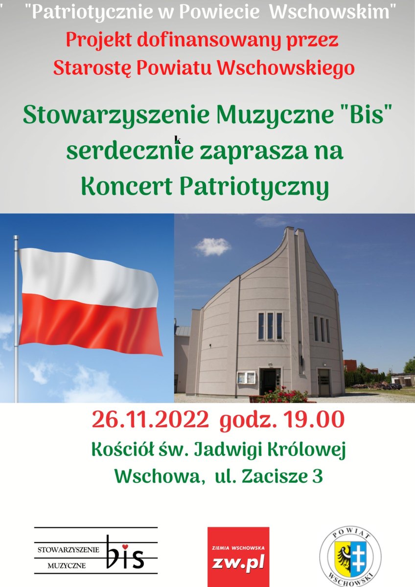 Stowarzyszenie Muzyczne „Bis” zaprasza na koncert pt. „Patriotycznie w Powiecie Wschowskim”, który odbędzie się 26 listopada w Kościele św. Jadwigi Królowej we Wschowie. Początek koncertu o godz. 19:00. Wstęp wolny.