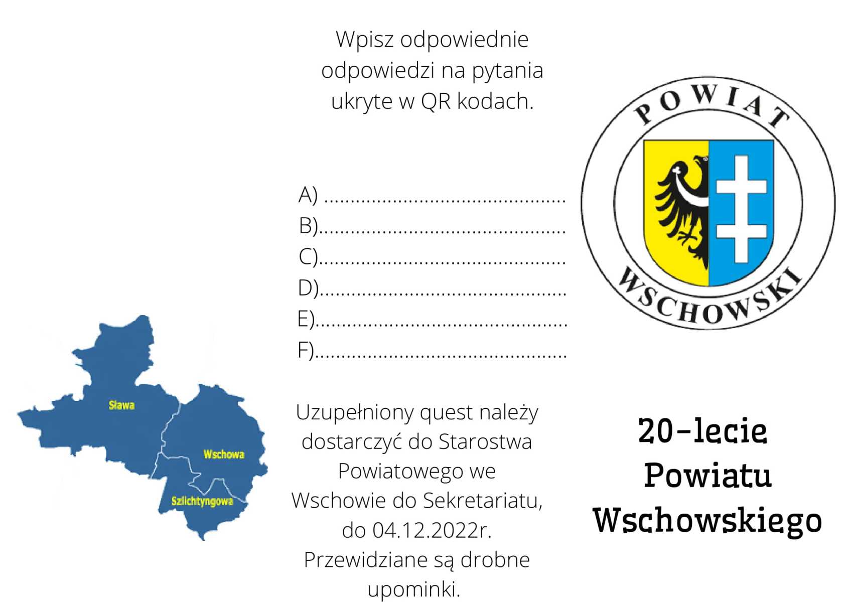 Starosta Wschowski Andrzej Bielawski oraz Komendant Hufca hm. Michalina Kuciewicz wraz z Komendą Hufca ZHP Wschowa zapraszają do wzięcia udziału w Queście z okazji 20-lecia Powiatu Wschowskiego.
