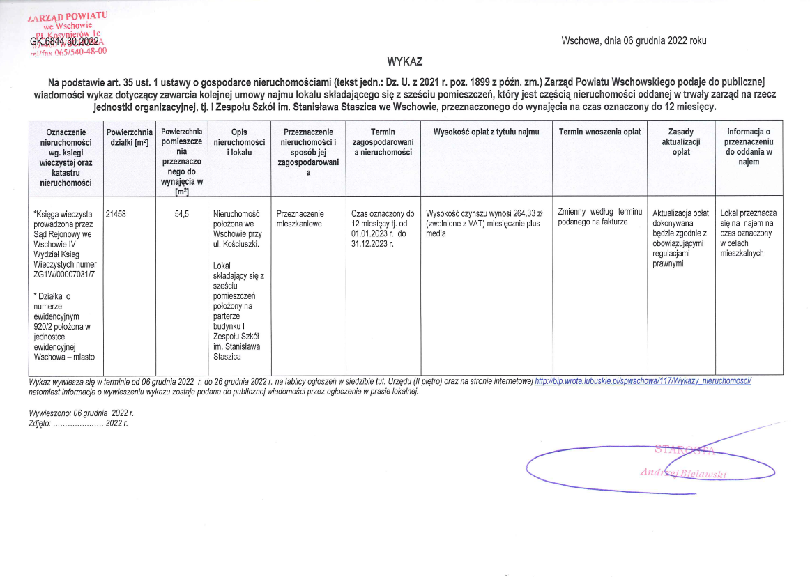 Wykaz dot. zawarcia kolejnej umowy najmu lokalu składającego się z sześciu pomieszczeń, który jest częścią nieruchomości oddanej w trwały zarząd na rzecz jednostki organizacyjnej, tj. I ZS we Wschowie, przeznaczonego do wynajęcia na czas oznaczony do 12 miesięcy