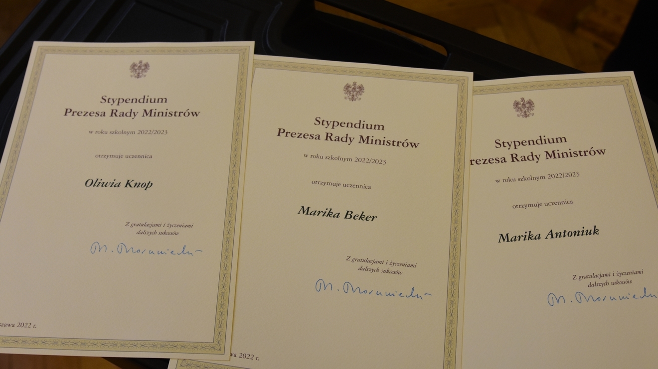 Dyrektor I Zespołu Szkół Piotr Wieland wręczył ww. uczennicom decyzje Prezesa Rady Ministrów Mateusza Morawieckiego potwierdzające spełnienie przez nie wymagań niezbędnych do otrzymania stypendium oraz pogratulował im uzyskanych wyników i życzył sukcesów na maturze i w dalszej edukacji.