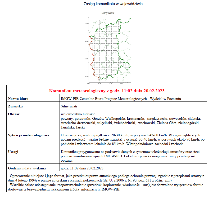 Obserwuje się wiatr o prędkości 20-30 km/h, w porywach 45-60 km/h. W ciągu najbliższych godzin prędkość wiatru będzie wzrastać i osiągać 30-40 km/h, w porywach około 70 km/h, po południu i wieczorem lokalnie do 85 km/h.
