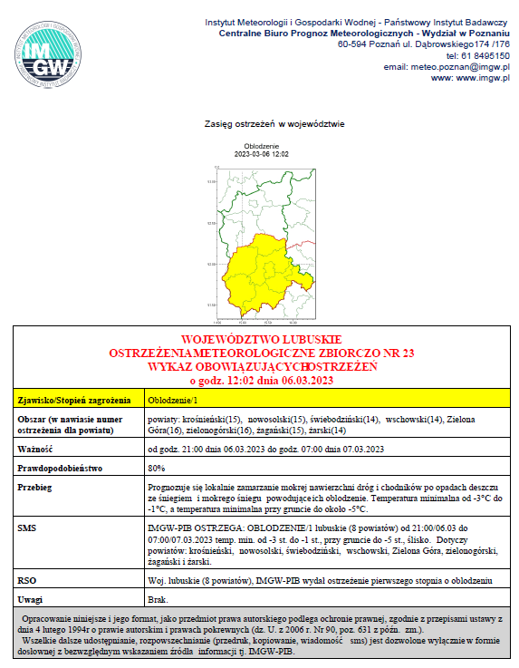 Ostrzeżenie meteorologiczne IMGW-PIB od godz. 21:00 dnia 06.03.2023 do godz. 7:00 dnia 07.03.2023 r.