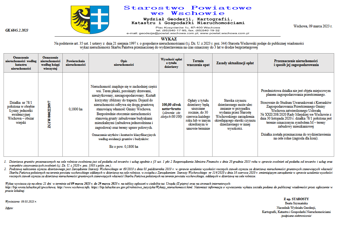 Na podstawie art. 35 ust. 1 ustawy z dnia 21 sierpnia 1997 r. o gospodarce nieruchomościami (t.j. Dz. U. z 2023 r. poz. 344) Starosta Wschowski podaje do publicznej wiadomości wykaz nieruchomości Skarbu Państwa przeznaczonej do wydzierżawienia na czas oznaczony do 3 lat w drodze bezprzetargowej – Działka nr 78/1 położona w obrębie Łysiny jednostki ewidencyjnej Wschowa – obszar wiejski.