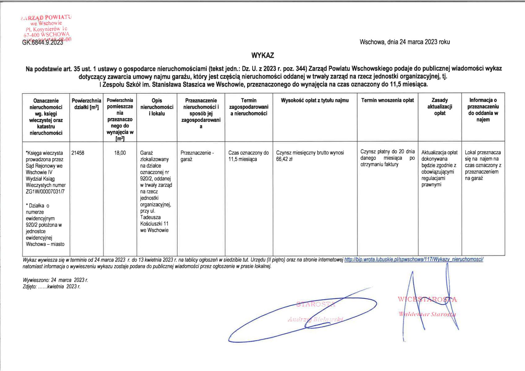 Na podstawie art. 35 ust. 1 ustawy o gospodarce nieruchomościami (t.j. Dz. U. z 2023 r. poz. 344) Zarząd Powiatu Wschowskiego podaje do publicznej wiadomości wykaz dotyczący zawarcia umowy najmu garażu, który jest częścią nieruchomości oddanej w trwały zarząd na rzecz jednostki organizacyjnej tj. I Zespołu Szkół im. Stanisława Staszica we Wschowie, przeznaczonego do wynajęcia na czas oznaczony 11,5 miesiąca.