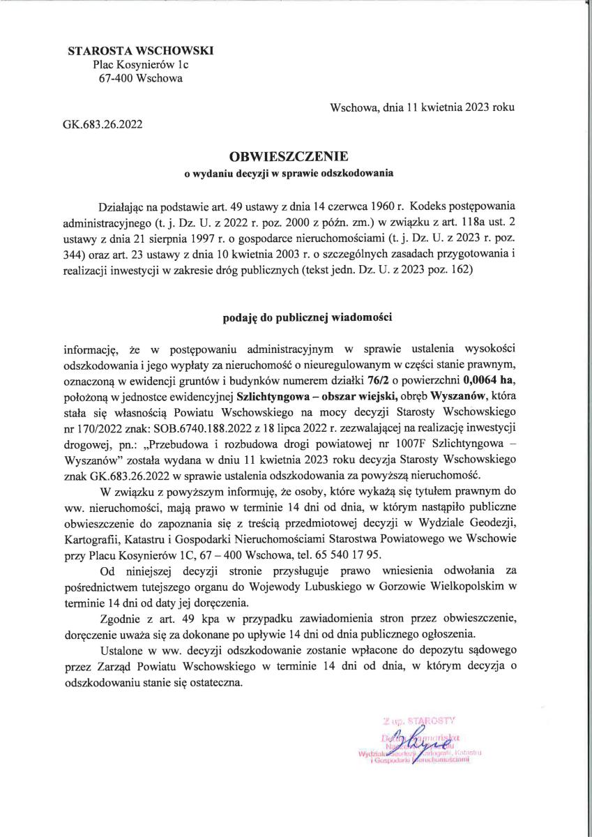 Obwieszczenie o wydaniu decyzji w sprawie odszkodowania za nieruchomość o nieuregulowanym w części stanie prawnym, oznaczoną w ewidencji gruntów i budynków numerem działki 76/2 o powierzchni 0,0064 ha, położoną w jednostce ewidencyjnej Szlichtyngowa – obszar wiejski, obręb Wyszanów.