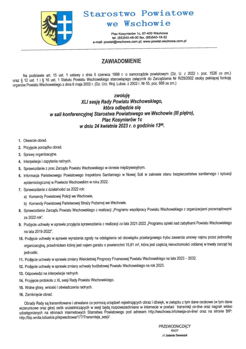Zawiadomienie o XLI sesji Rady Powiatu Wschowskiego