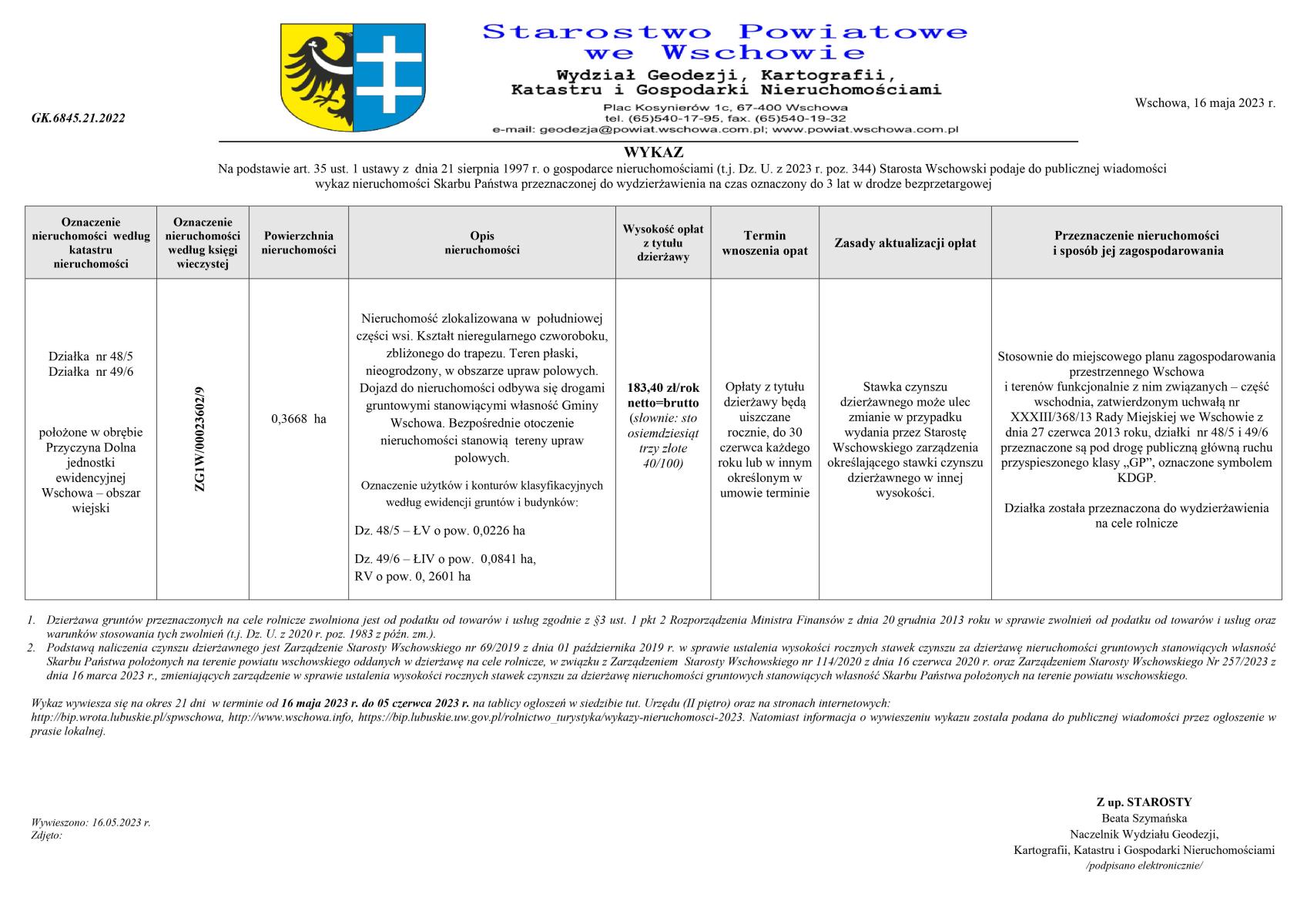 Zgodnie z art. 35 ust. 1 i 2 z dnia 21 sierpnia 1997 roku o gospodarce nieruchomościami (tj. Dz. U. z 2023 r. poz. 344) Starosta Wschowski podaje do publicznej wiadomości wykaz nieruchomości Skarbu Państwa przeznaczonej do wydzierżawienia na czas oznaczony do 3 lat w drodze bezprzetargowej.