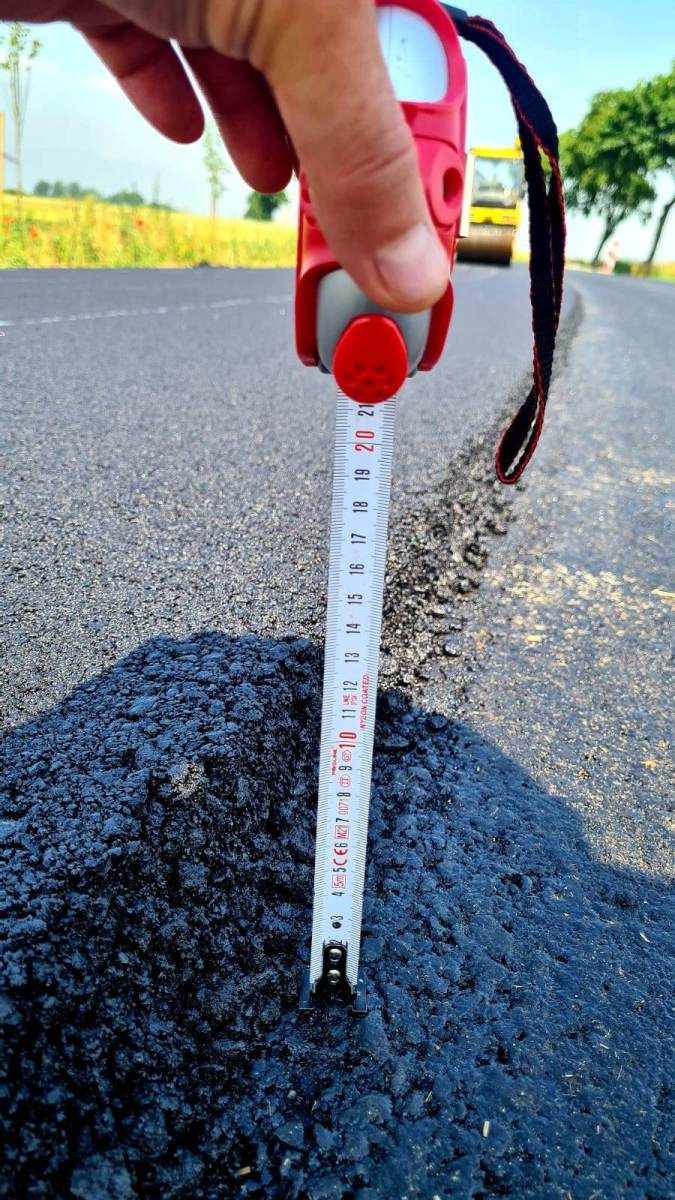 Aktualnie trwają prace polegające na ułożeniu warstwy ścieralnej górnej nawierzchni drogi.