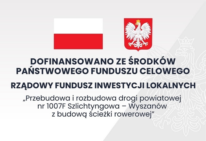 Inwestycja Powiatu Wschowskiego powstaje w ramach zadania pn. „Przebudowa i rozbudowa drogi powiatowej nr 1007F Szlichtyngowa – Wyszanów w formule zaprojektuj i wybuduj” ze środków pozyskanych z Rządowego Funduszu Inwestycji Lokalnych.