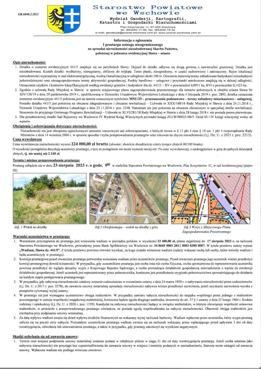 Informacja o ogłoszeniu I przetargu ustnego nieograniczonego Informacja o ogłoszeniu I przetargu ustnego nieograniczonego na sprzedaż nieruchomości niezabudowanej Skarbu Państwa, położonej w jednostce ewidencyjnej Sława – miasto. Informacja o przetargu Zdjęcie 1 z 2 informacja o ogłoszeniu przetargu