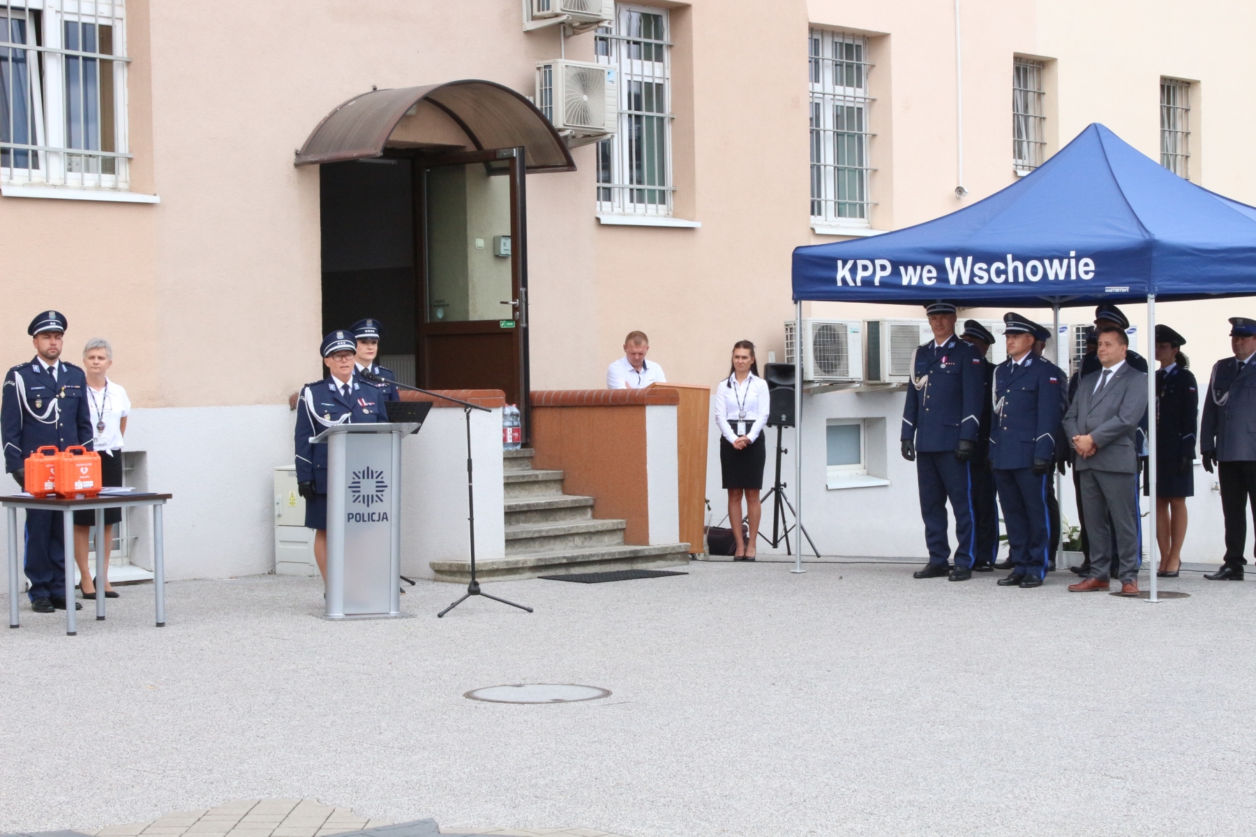 Następnie na dziedzińcu Komendy Powiatowej Policji we Wschowie przy popiersiu Marszałka Józefa Piłsudskiego odbył się uroczysty apel podczas którego inspektor Szymon Sędzik – Zastępca Komendanta Wojewódzkiego Policji w Gorzowie Wielkopolskim wraz z komisarz Andrzeliką Łuczak – Komendantem Komendy Powiatowej Policji we Wschowie wręczyli awanse na wyższe stopnie.