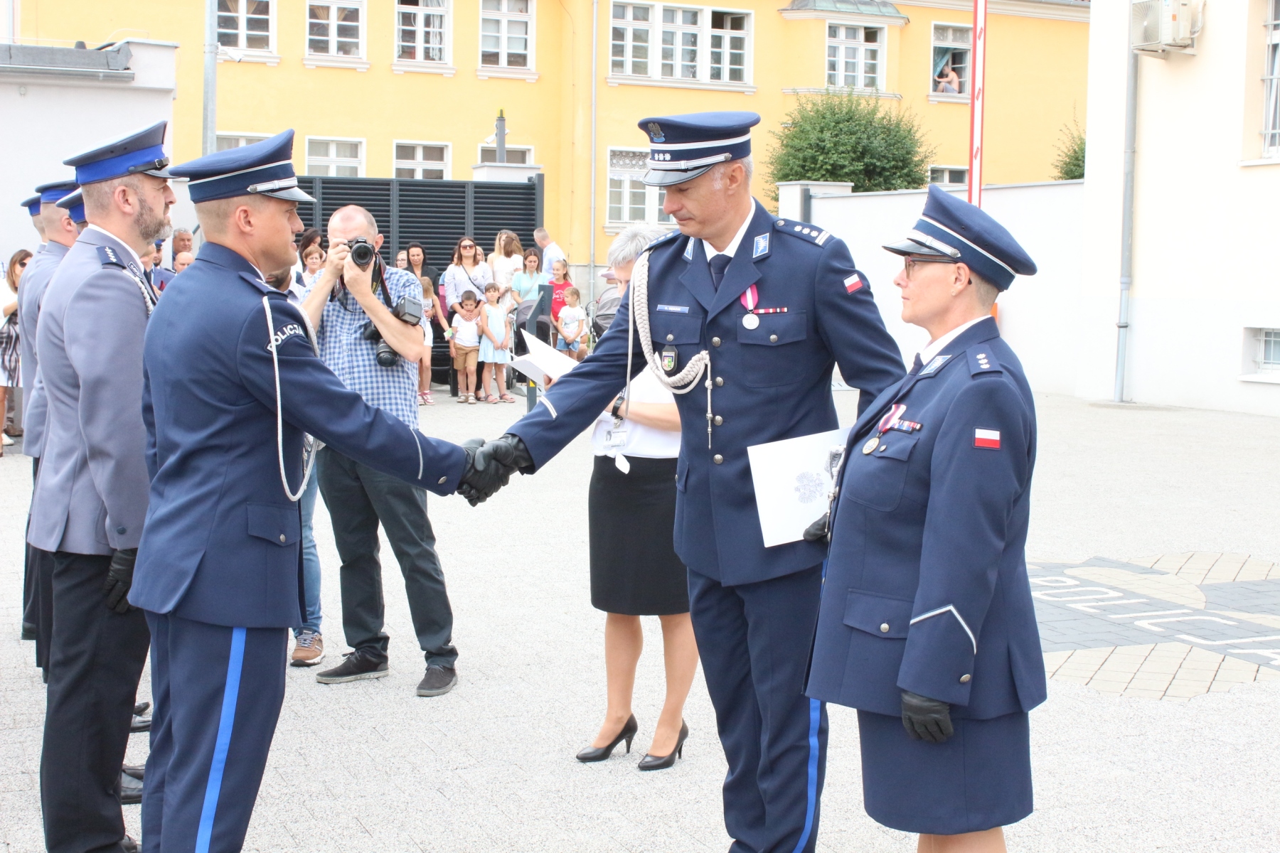 Następnie na dziedzińcu Komendy Powiatowej Policji we Wschowie przy popiersiu Marszałka Józefa Piłsudskiego odbył się uroczysty apel podczas którego inspektor Szymon Sędzik – Zastępca Komendanta Wojewódzkiego Policji w Gorzowie Wielkopolskim wraz z komisarz Andrzeliką Łuczak – Komendantem Komendy Powiatowej Policji we Wschowie wręczyli awanse na wyższe stopnie.