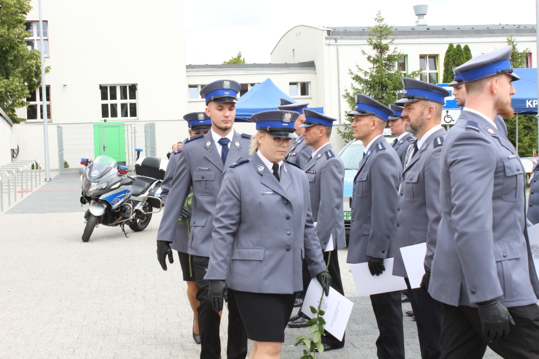 Następnie na dziedzińcu Komendy Powiatowej Policji we Wschowie przy popiersiu Marszałka Józefa Piłsudskiego odbył się uroczysty apel podczas którego inspektor Szymon Sędzik – Zastępca Komendanta Wojewódzkiego Policji w Gorzowie Wielkopolskim wraz z komisarz Andrzeliką Łuczak – Komendantem Komendy Powiatowej Policji we Wschowie wręczyli awanse na wyższe stopnie.
