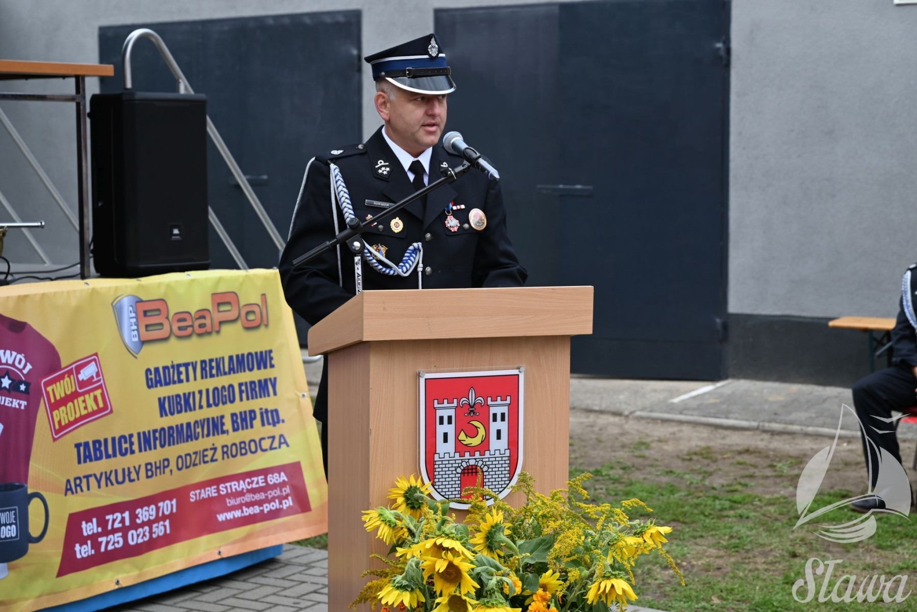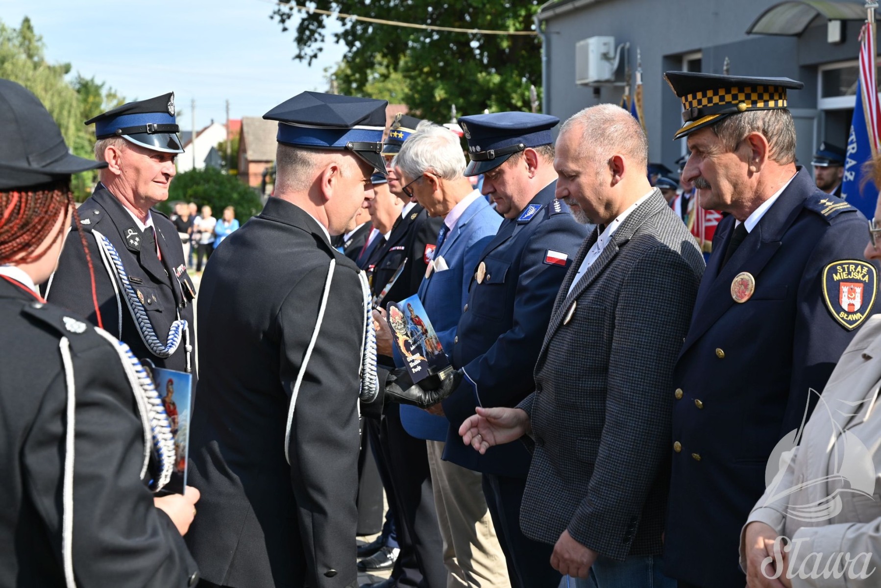 Szczególnym momentem jubileuszu była ceremonia zmiany sztandaru. Po pożegnaniu dotychczasowego, towarzyszącego druhom od 1988 roku, strażacy otrzymali nowy sztandar ufundowany przez społeczność lokalną i sponsorów. Akt ufundowania odczytał i przekazał Przewodniczący Komitetu Fundacji Sztandaru – Burmistrz Sławy Cezary Sadrakuła, a symbolicznym gestem było przybicie pamiątkowego gwoździa do tablicy fundatorów.
