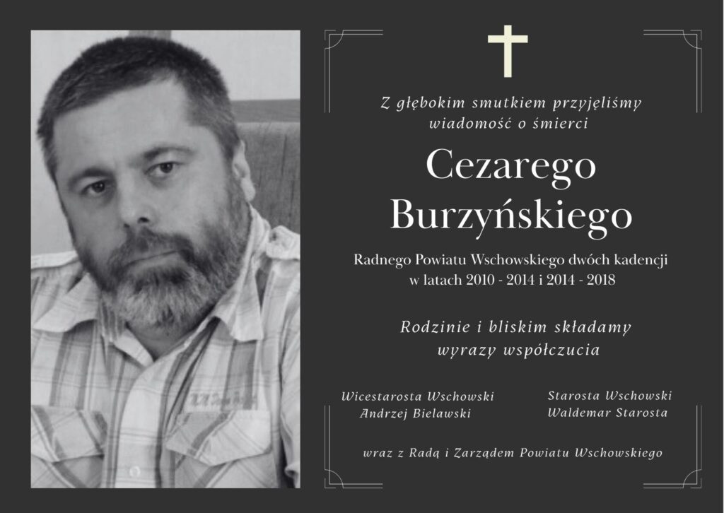 Z wielkim żalem przyjęliśmy wiadomość o śmierci Pana Cezarego Burzyńskiego –radnego Powiatu Wschowskiego dwóch kadencji w latach 2010 – 2014 i 2014 – 2018.