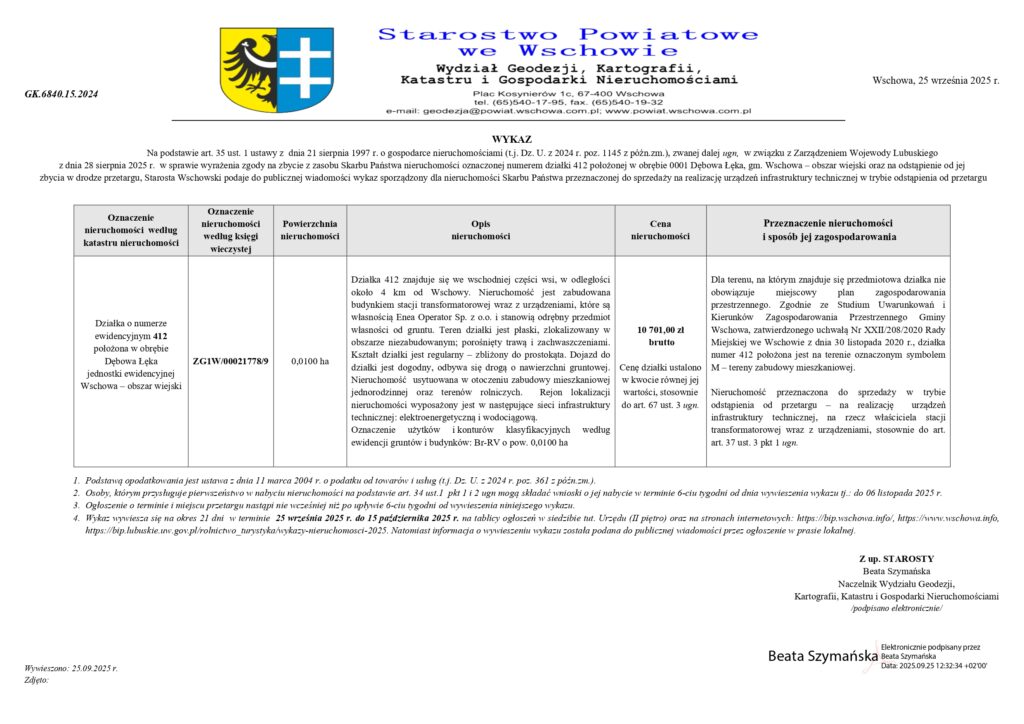 Na podstawie art. 35 ust. 1 ustawy z dnia 21 sierpnia 1997 r. o gospodarce nieruchomościami (tekst jedn.: Dz. U. z 2024 r. poz. 1145 z późn. zm.) zwanej dalej ugn, w związku z Zarządzeniem Wojewody Lubuskiego z dnia 28 sierpnia 2025 r. w sprawie wyrażenia zgody na zbycie z zasobu Skarbu Państwa nieruchomości oznaczonej numerem działki 412 położonej w obrębie 0001 Dębowa Łęka, gm. Wschowa – obszar wiejski oraz na odstąpienie od jej zbycia w drodze przetargu, Starosta Wschowski podaje do publicznej wiadomości wykaz sporządzony dla nieruchomości Skarbu Państwa przeznaczonej do sprzedaży na realizację urządzeń infrastruktury technicznej w trybie odstąpienia od przetargu