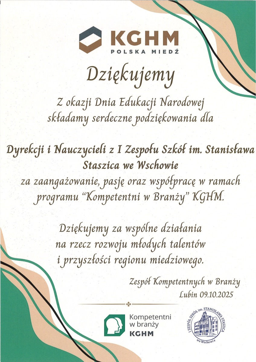 I Zespół Szkół im. Stanisława Staszica we Wschowie podpisał porozumienie o współpracy z KGHM Polska Miedź S.A. na kolejny rok szkolny w ramach projektu „Kompetentni w branży górniczo–hutniczej. KGHM – kluczowy partner w kształceniu zawodowym”.