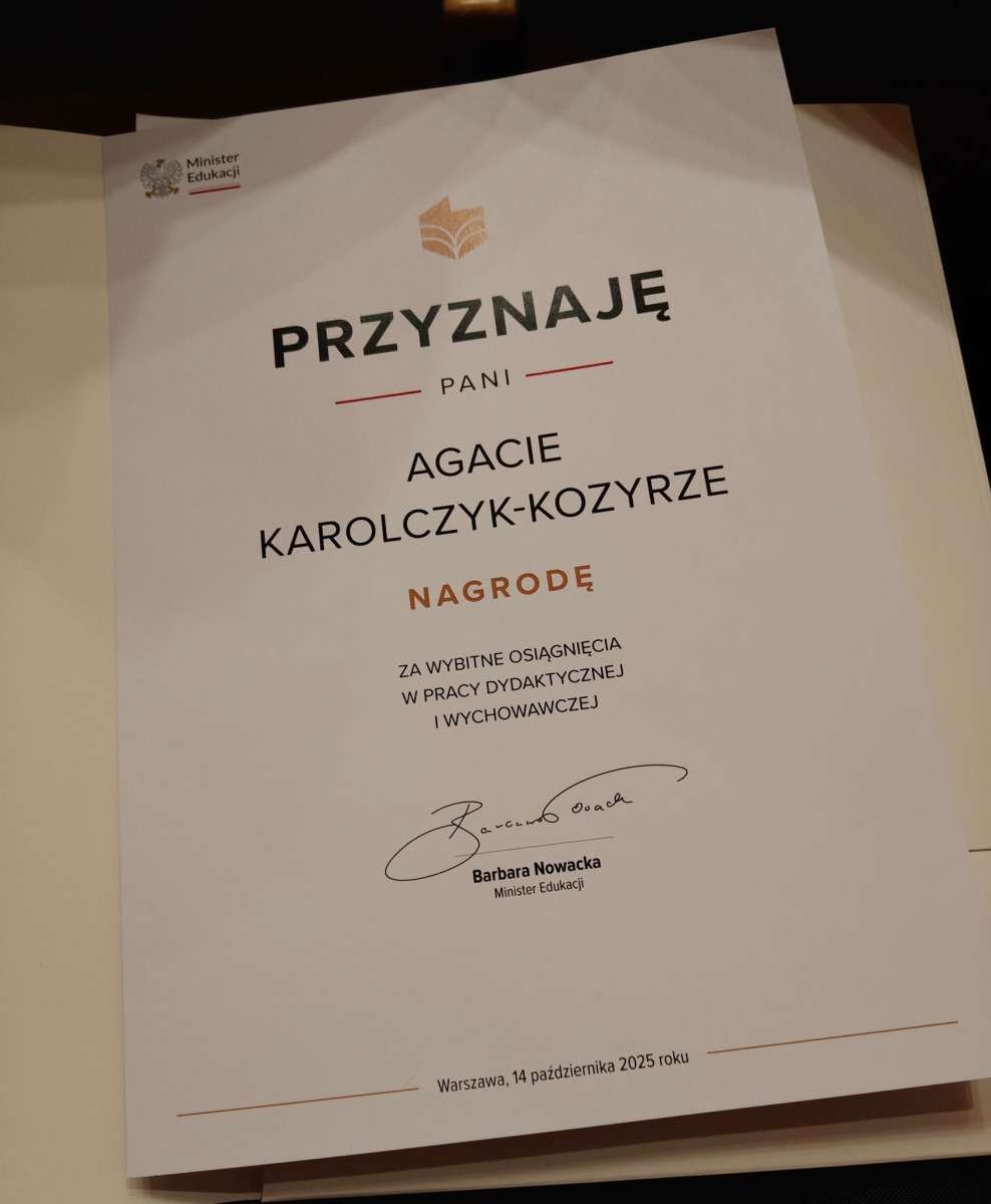 Cieszymy się, że wysiłek i determinacja Pani Dyrektor zostały dostrzeżone na szczeblu krajowym, a obrany kierunek rozwoju szkoły zyskał uznanie Ministerstwa Edukacji Narodowej.
