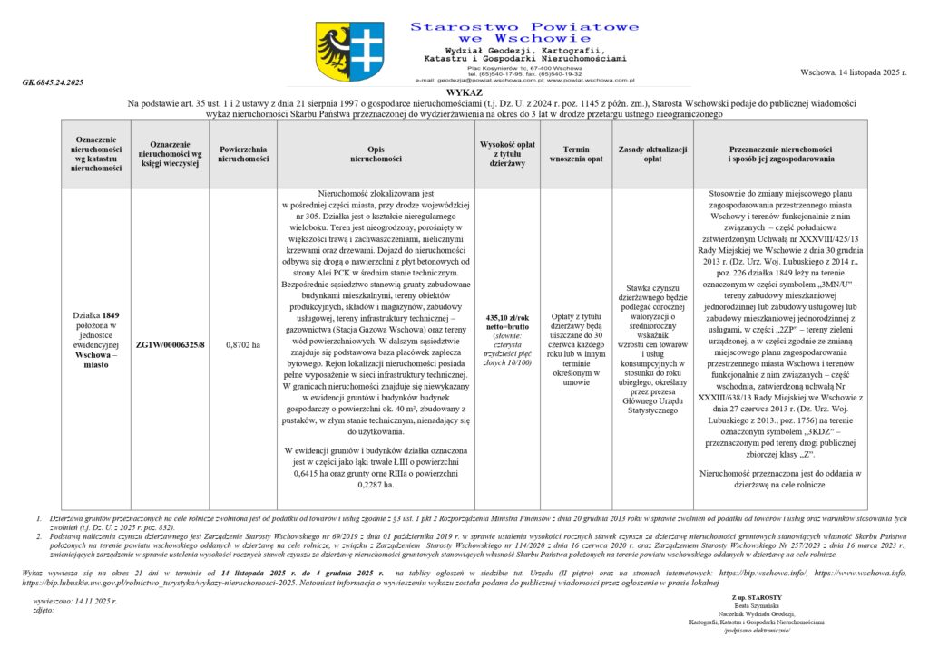 Na podstawie art. 35 ust. 1 i 2 ustawy z dnia 21 sierpnia 1997 o gospodarce nieruchomościami (t.j. Dz. U. z 2024 r. poz. 1145 z późn. zm.), Starosta Wschowski podaje do publicznej wiadomości wykaz nieruchomości Skarbu Państwa przeznaczonej do wydzierżawienia na okres do 3 lat w drodze przetargu ustnego nieograniczonego