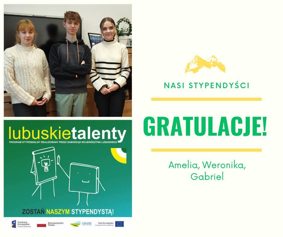 Powiat Wschowski z ogromną radością składa gratulacje uczniom I Liceum Ogólnokształcącego im. Tomasza Zana we Wschowie, którzy otrzymali stypendia w ramach programu „Lubuskie Talenty”. Wśród tegorocznych laureatów znaleźli się: