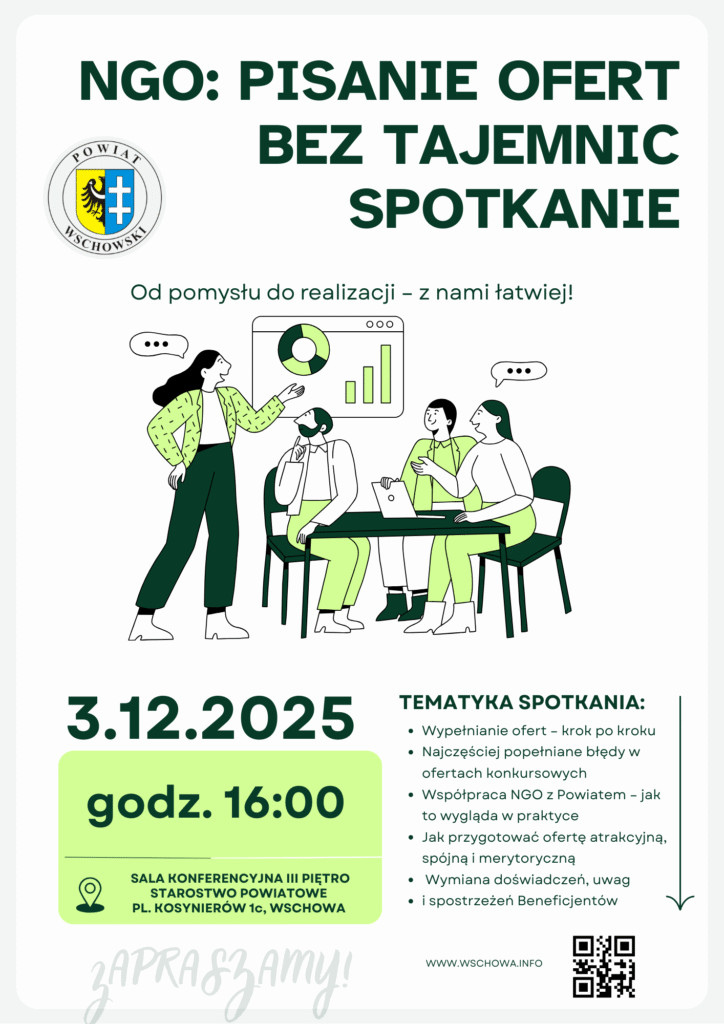 3 grudnia o godz. 16:00 w Starostwie Powiatowym we Wschowie odbędzie się praktyczne spotkanie dla organizacji pozarządowych, które chcą udoskonalić swoje oferty konkursowe i poznać zasady współpracy z Powiatem.