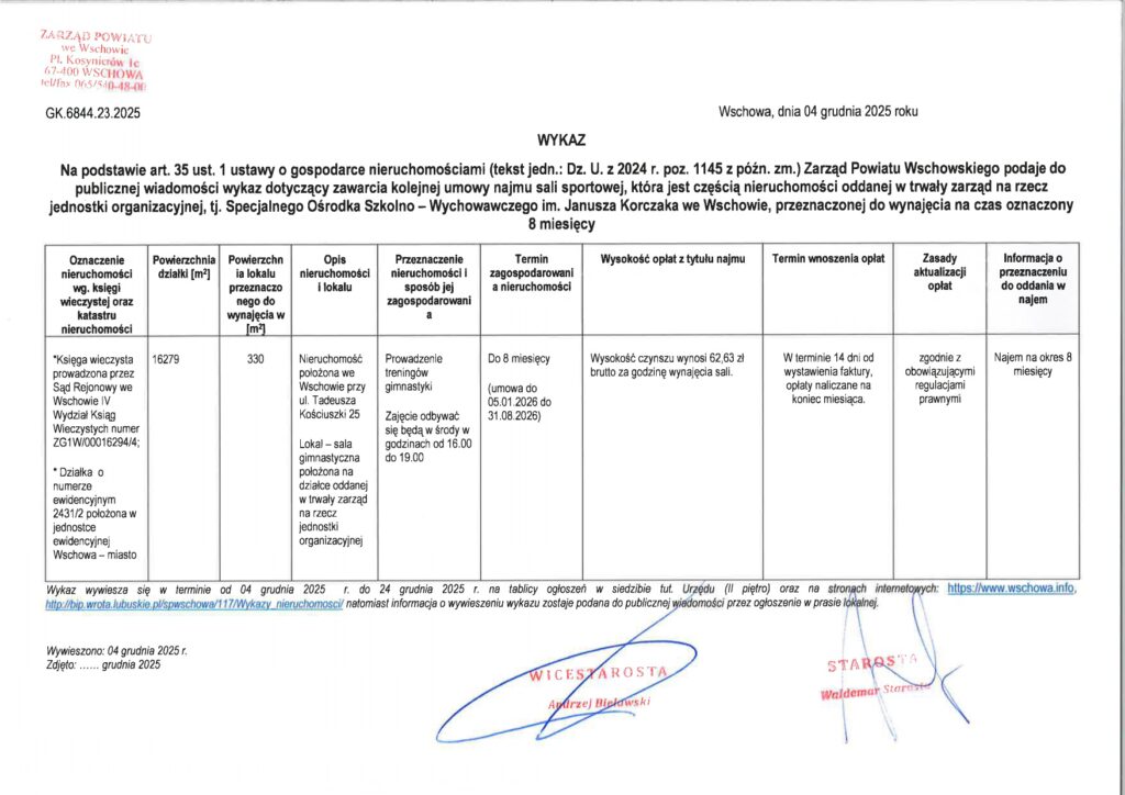 Na podstawie art. 35 ust. 1 ustawy o gospodarce nieruchomościami (tekst jedn.: Dz. U. z 2024 r. poz. 1145 z późn. zm.) Zarząd Powiatu Wschowskiego podaje do publicznej wiadomości wykaz dotyczący zawarcia kolejnej umowy najmu sali sportowej, która jest częścią nieruchomości oddanej w trwały zarząd na rzecz jednostki organizacyjnej, tj. Specjalnego Ośrodka Szkolno – Wychowawczego im. Janusza Korczaka we Wschowie, przeznaczonej do wynajęcia na czas oznaczony 8 miesięcy