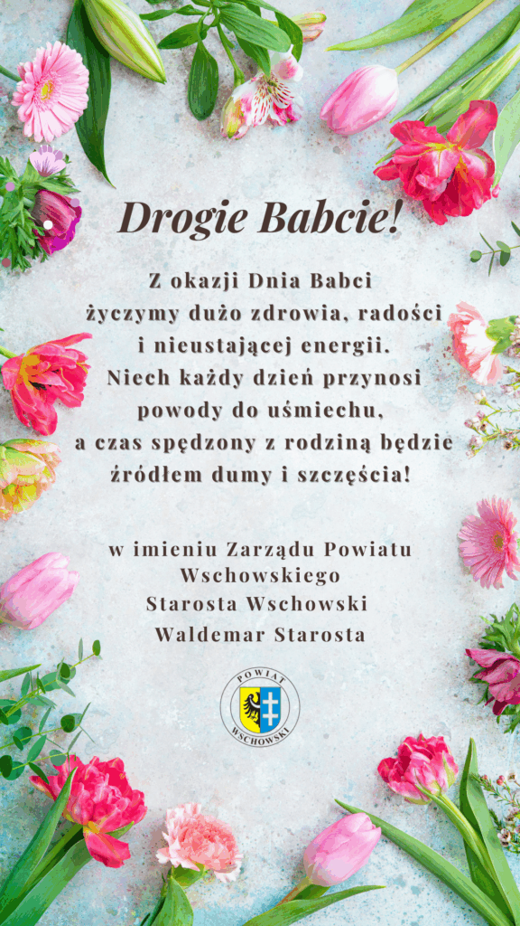 Dzień Babci – 21 stycznia Z okazji Dnia Babci życzymy dużo zdrowia, radości i nieustającej energii Niech każdy dzień przynosi powody do uśmiechu, a czas spędzony z rodziną będzie źródłem dumy i szczęścia W imieniu Zarządu Powiatu Wschowskiego Waldemar Starosta Starosta Wschowski