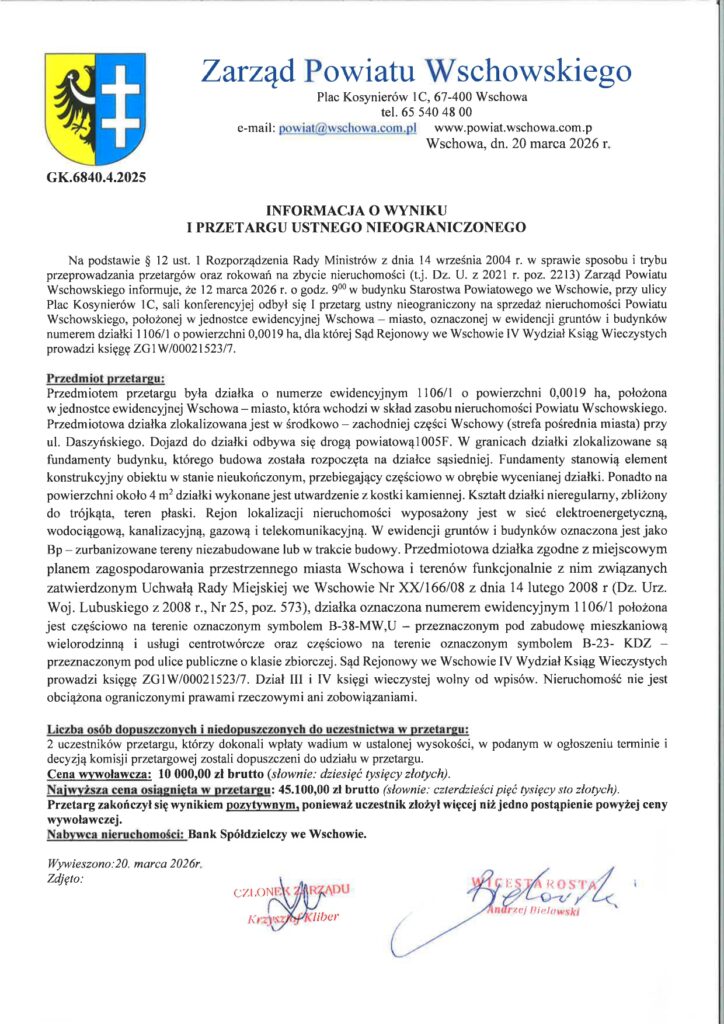 Zarząd Powiatu Wschowskiego informuje, że w dniu 12 marca 2026 r. w siedzibie Starostwa Powiatowego we Wschowie odbył się I przetarg ustny nieograniczony na sprzedaż nieruchomości stanowiącej własność Powiatu Wschowskiego, położonej we Wschowie.