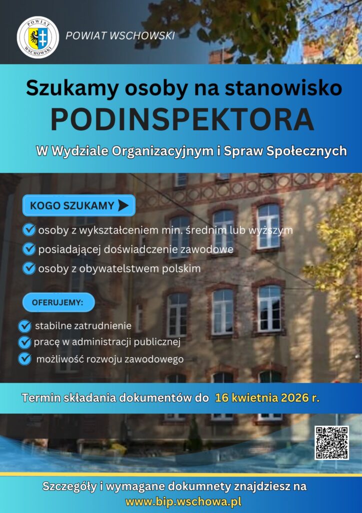 Starostwo Powiatowe we Wschowie ogłosiło nabór osoby na stanowisko podinspektora w Wydziale Organizacyjnym i Spraw Społecznych.