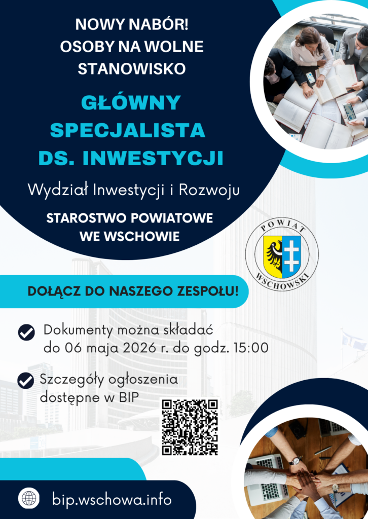 W Starostwo Powiatowe we Wschowie ogłoszono nabór na stanowisko Głównego Specjalisty ds. Inwestycji w Wydziale Inwestycji i Rozwoju. To propozycja dla osób z doświadczeniem w branży budowlanej, które chcą mieć realny wpływ na przygotowanie i realizację inwestycji na terenie Powiatu Wschowskiego.