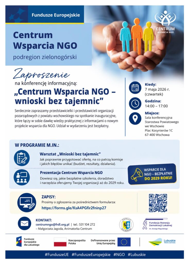 Wydarzenie stanowi doskonałą okazję do zdobycia praktycznej wiedzy z zakresu przygotowywania wniosków oraz poznania dostępnych form wsparcia dla sektora NGO. Spotkanie skierowane jest do wszystkich osób zaangażowanych w działalność organizacji pozarządowych z terenu powiatu wschowskiego, które chcą rozwijać swoje kompetencje i skuteczniej pozyskiwać środki na realizację działań społecznych.